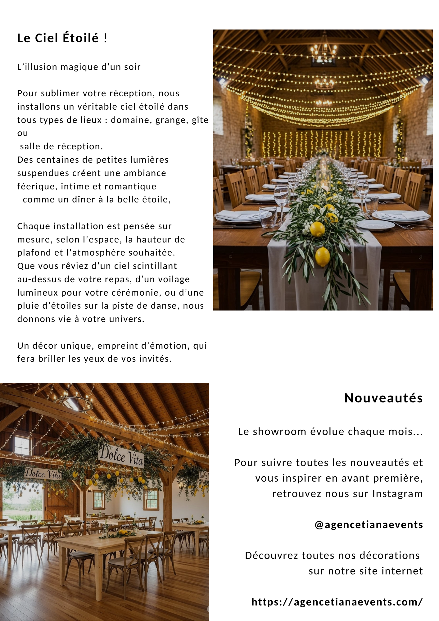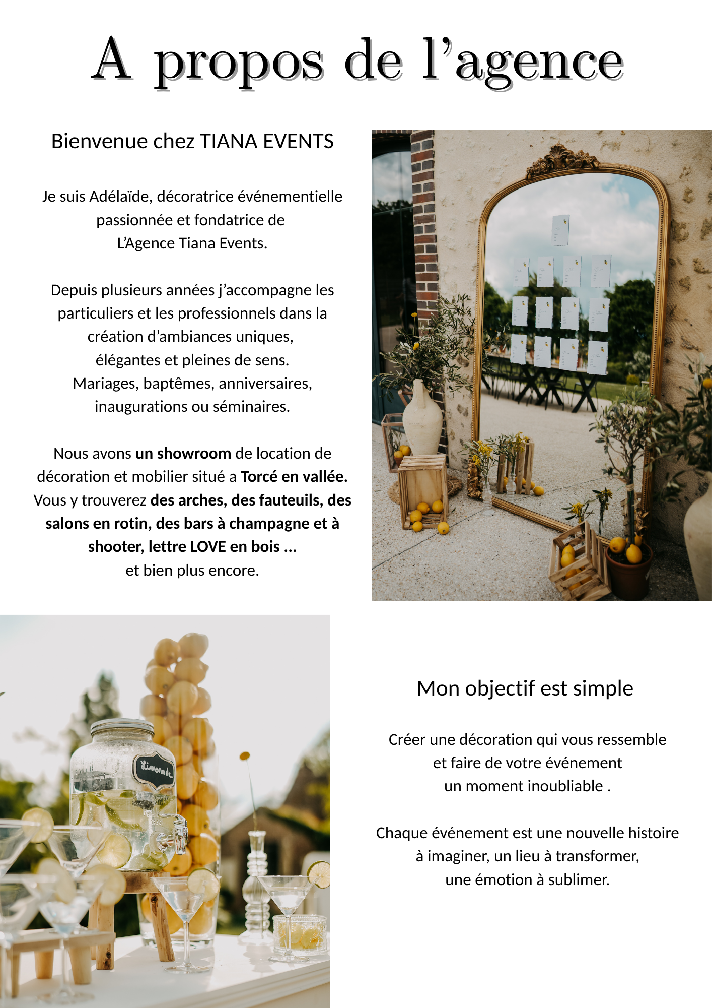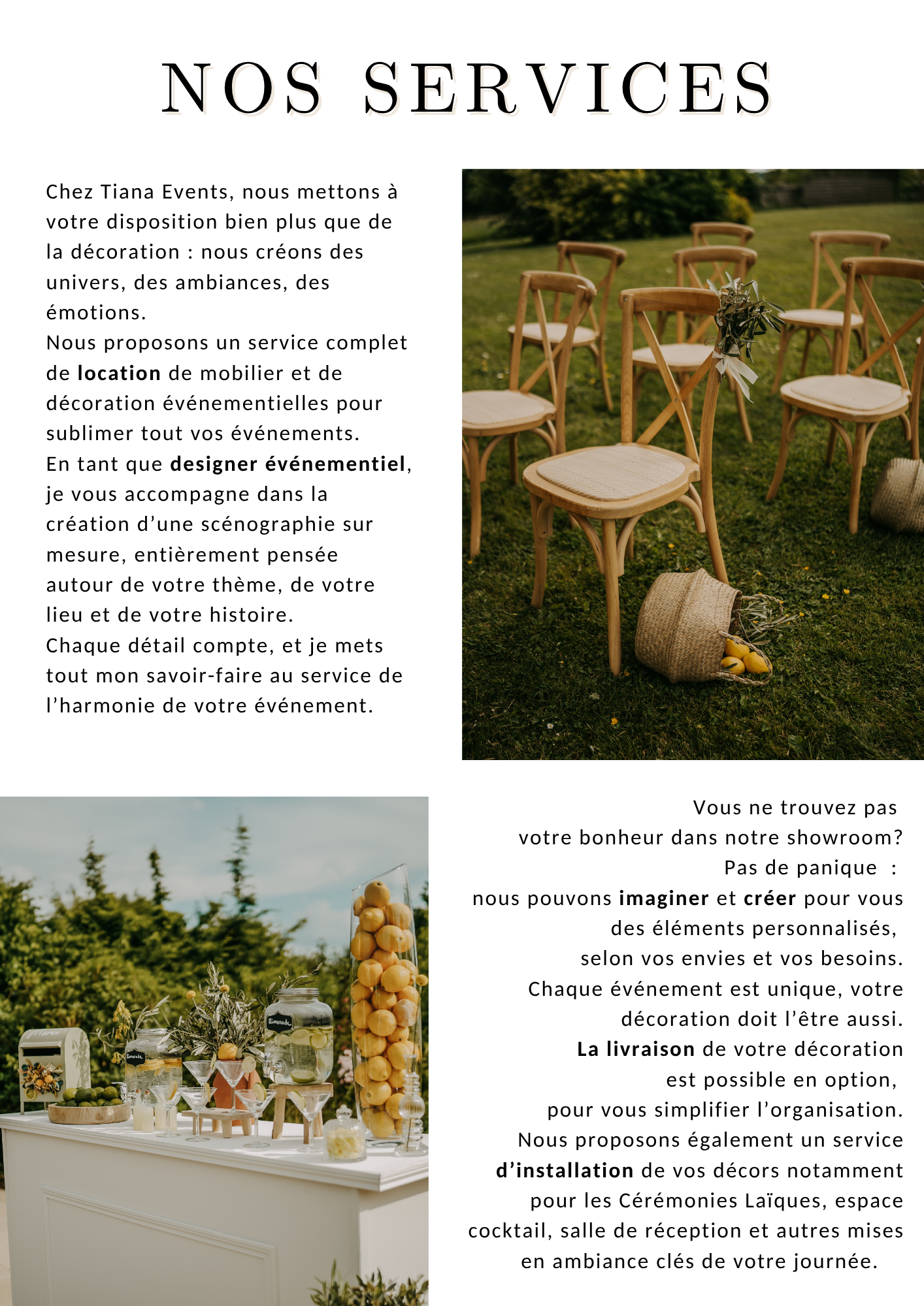 Chez Tiana Events, nous mettons à votre disposition bien plus que de la décoration: nous créons des univers, des ambiances, des émotions. Nous proposons un service complet de location de mobilier et de décoration pour sublimer tous vos événements.